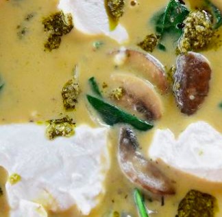 Serve, garnished with a few dollops of ricotta cheese and a little bit of pesto, if desired.