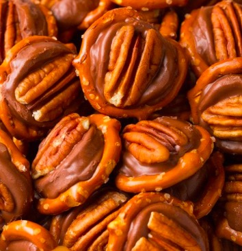 Gently press a pecan half onto the top of each caramel, pressing just enough for the caramel to fill the insides of the pretzels. Set aside to cool completely.