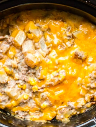 Wash and dry potatoes; cut into small cubes, leaving the skins on; pour over meat and onion in the crock pot. Add soup, salt, pepper, garlic powder, corn and half of the cheese; stir well. Spread out into a flat, even layer.