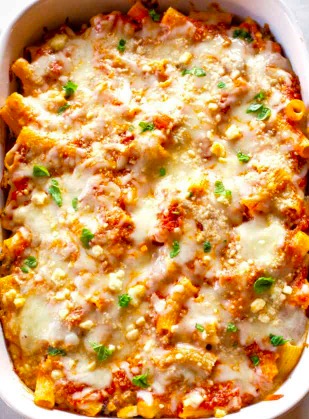 Whether making this dish for family or guests, everyone will love it. It's the best baked ziti you will ever eat with it's creamy sauce, sausage, pasta and cheeses. It can also be made without meat, if desired.