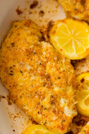 Dip each chicken cutlet on both sides in the lemon oil, then in the breading. Place on a plate or piece of aluminum foil. Repeat with the remaining cutlets.