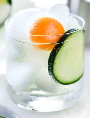 Serve, garnished with a cucumber slice and cantaloupe ball.