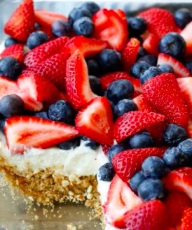 This dessert is a cousin of the classic Strawberry Pretzel Salad but much less sweet. It starts with a pretzel crust, then a cream cheese filling that is topped with fresh strawberries and blueberries.