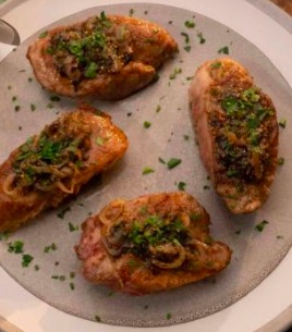 Lower heat under the skillet to medium. Add 2 T. butter and shallots; cook, stirring, until softened, about 2 minutes. Add cider, mustard, parsley, chives and a bit of salt and pepper. Simmer, scraping up any brown bits, until reduced by about half, about 2 minutes.
