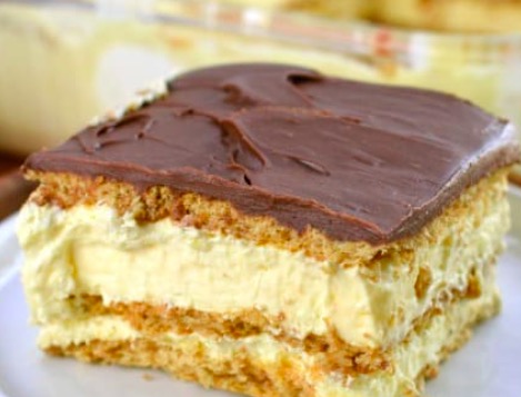 This easy to make dessert isn't really a cake or even an eclair, but who cares? It's still delicious. It's an old-fashioned icebox cake where you need to bring your patience waiting for it to set up in the refrigerator.