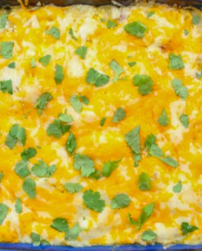 If you love chicken enchiladas but don't like the time and effort to roll the tortillas, then this recipe is for you. It's a gooey, delicious, satisfying dinner that's ready in a jiffy.