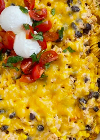 This quick and easy dish can be on the table in less than 45 minutes. Even the pickiest eaters will love the chicken, pasta, cheese, corn and beans with taco seasoning.