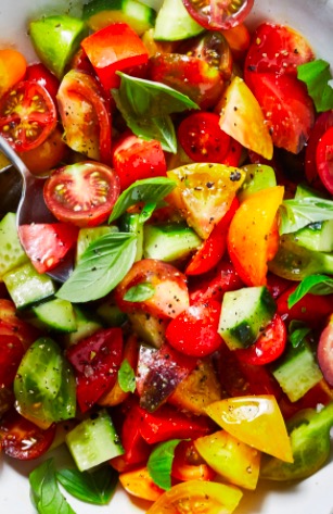 Add tomatoes, cucumber and basil leaves to another bowl.