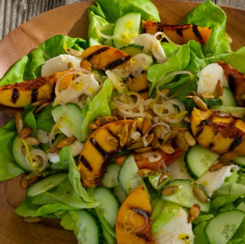Make a wonderful salad with lettuce, mozzarella cheese and grilled peaches drizzled with a Lemon-Honey Vinaigrette.