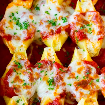 This vegetarian dish is the perfect meal for pasta lovers. It's made with three different cheeses, jumbo shells and marinara sauce. It's a very comforting and satisfying dish.
