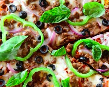 Pour remaining 2 c. pizza sauce evenly over the top, spreading evenly. Top with remaining 1 c. Mozzarella cheese, crumbled meat, bell pepper rings, onions and black olives.