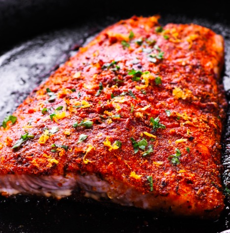 Add 1 T. olive oil to an oven-safe skillet; place fillet in the skillet skin side down. Add remaining olive oil over the top of the salmon. Season with salt; rub seasoning blend into the salmon. Top with lemon juice and zest.