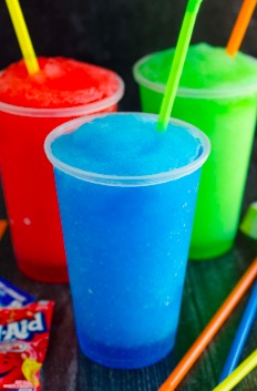 Pour cold water, ice cubes, sugar and Kool-Aid into a high speed blender like a Ninja or Blentec type blender. Blend until just smooth and the ice reaches a slushie consistency.