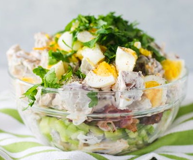 Top with about half of the bacon and then half of the parsley. Spread remaining dressing on top. Sprinkle with remaining bacon and parsley, to garnish.