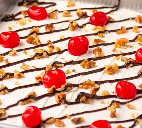 Drizzle with chocolate syrup; add maraschino cherries and walnuts just before serving.