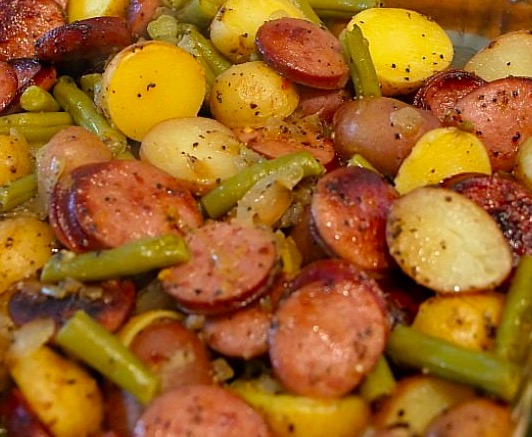 You will love this all in one dinner with sausage, potatoes and green beans. It's tasty and hearty and easy to make.