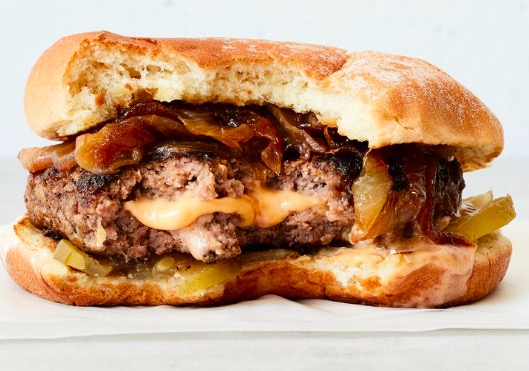 With just a few ingredients, you can make a seriously delicious burger with a slice of melted cheese in the center. Top with caramelized onions and bread and butter pickles on a bun and you have the best burger you will ever eat.