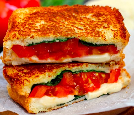 In just minutes, you can turn your boring grilled cheese a gourmet sandwich with fresh mozzarella cheese, tomatoes, and fresh basil on toasted sourdough or other rustic white bread.