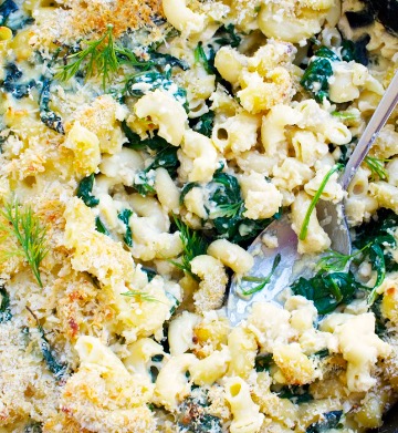 In just 30 minutes this delicious pasta dish can be on the dinner table. The macaroni is made in a tasty sauce and is packed with three different cheeses and spinach all topped with a crispy panko topping.