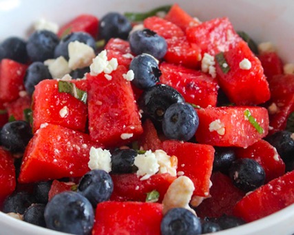 Make this simple, colorful and refreshing fruit salad for any summertime holiday party or gathering. It comes together quickly with fresh blueberries, watermelon chunks, feta cheese and mint with a sweet lemon dressing.
