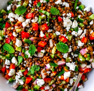 This healthy, bright salad is great for lunch or dinner. It's flavor packed with lentils, cucumber, bell pepper, seasonings, onion and feta with a lemon dressing.