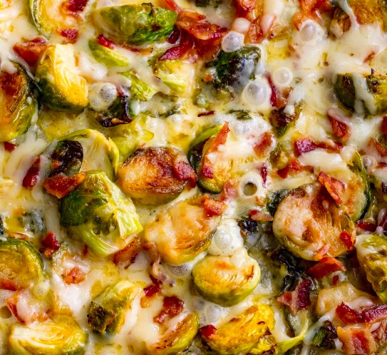 You'll love this low-carb, keto friendly side dish. The Brussels sprouts are baked in a creamy two cheese sauce and is topped with crispy crumbled bacon.