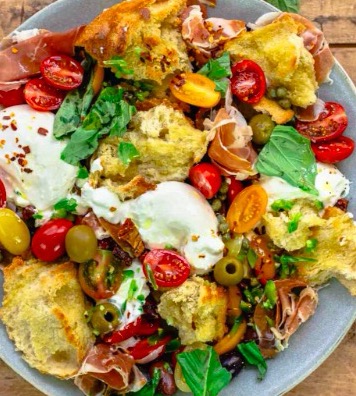 10 Minute Burrata with Tomatoes, Crusty Bread, Basil, and Prosciutto