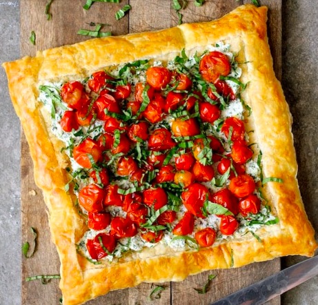 If you're craving pizza but want a more elegant way to serve it, this recipe is for you. Instead of a pizza crust, it's made with a sheet of puff pastry with cherry tomatoes, ricotta cheese and herbs.