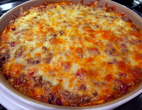 To the prepared casserole dish, add a layer of crushed tortilla chips, followed by a layer of the meat/bean mixture, then half of the cheese. Repeat layers. Cover with aluminum foil.