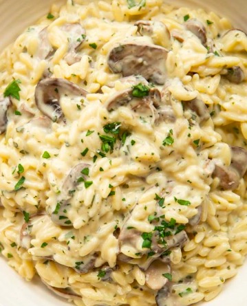 This orzo pasta dish is much like a risotto but without the effort and fuss. The flavor and texture is similar and features the pasta in a creamy, delicious sauce.