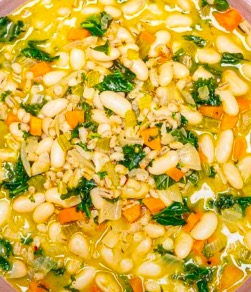 This healthy soup can be ready for dinner in less than an hour. It's loaded with vegetables, kale, barley and beans in a vegetable stock.
