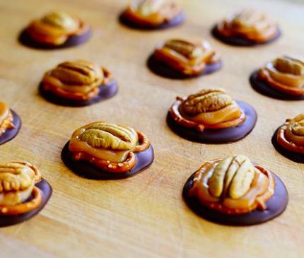 Gently press a pecan half onto each caramel, just enough for the caramel to fill the pretzel. Set aside to cool completely.