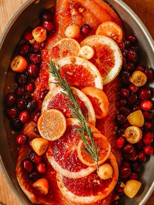 Serve family or friends this delicious salmon with a holiday twist. It's a healthy main dish that's packed with sweet, zesty and savory flavors.