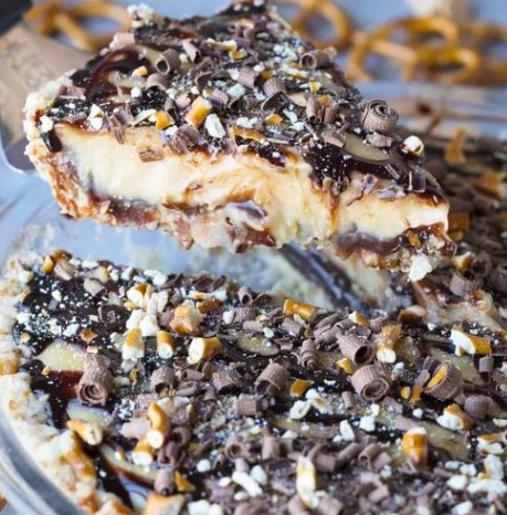 Serve this pie for holidays, special occasions or anytime you want a delicious dessert. It starts with a salty pretzel crust, hot fudge sauce, creamy peanut butter custard filling, all topped with more hot fudge sauce, crushed pretzels and chocolate curls