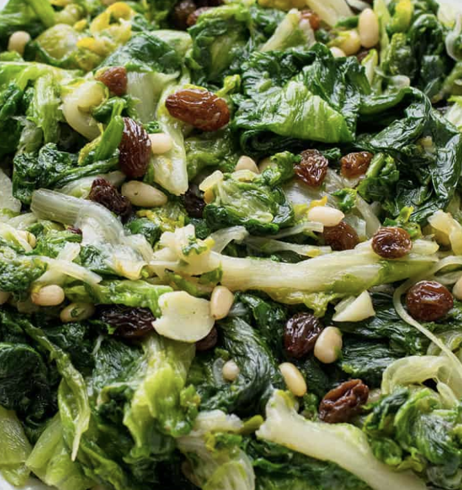 This is a simple, elegant side dish from Naples, Italy that is so delicious, everyone will want seconds. It is sweet and savory with the Italian greens, garlic, olives and raisins.