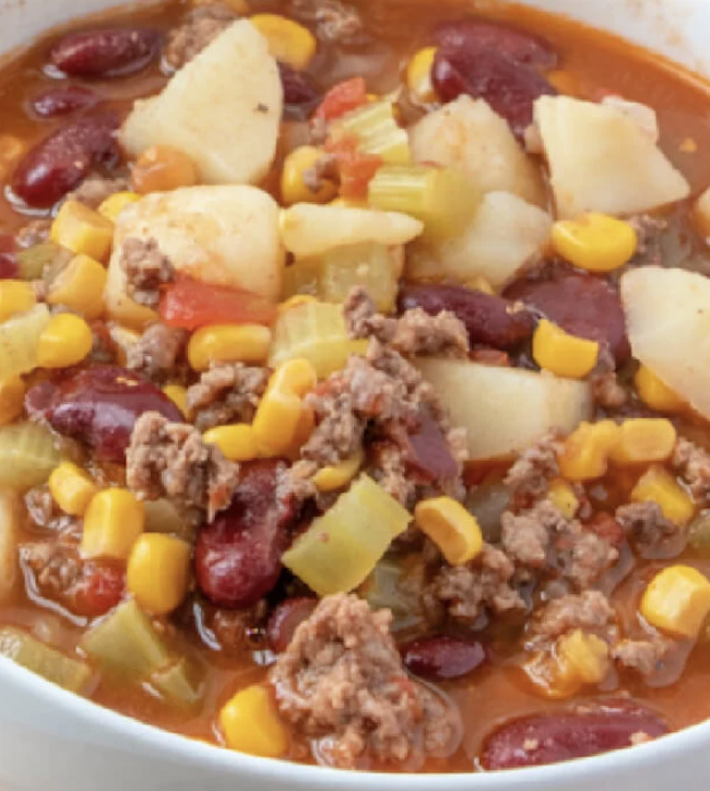 In the same large pot, layer in this order: ground beef, potatoes, onion, celery, beans, corn, and tomatoes. Season with salt and pepper.