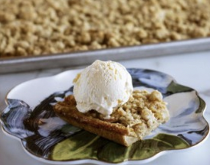 This apple tart has a biscuity base that resembles shortbread, and an oat crumble topping, with apple slices and caramel sauce in the center.