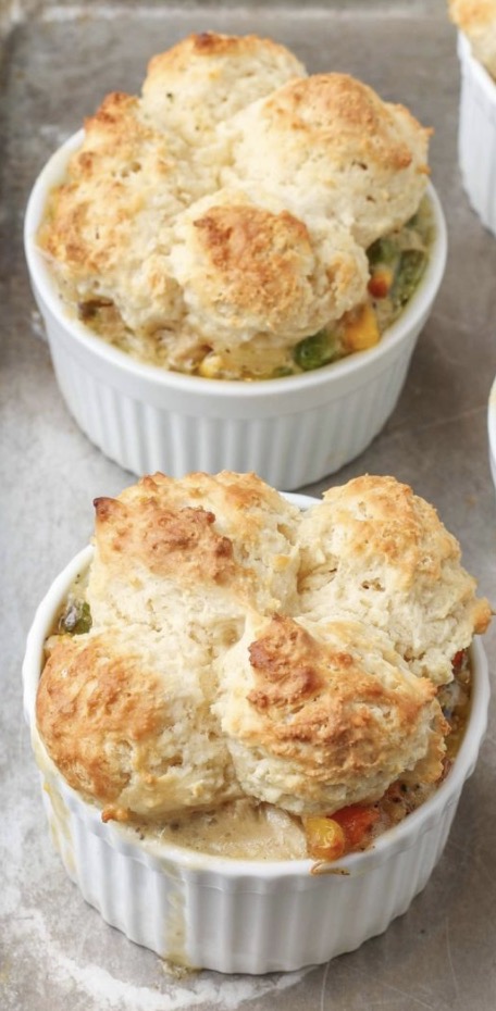 Everyone can enjoy their own chicken pot pie with these individual mini versions of the traditional ones. Chicken and veggies come together in a creamy filling topped with a flaky biscuit.