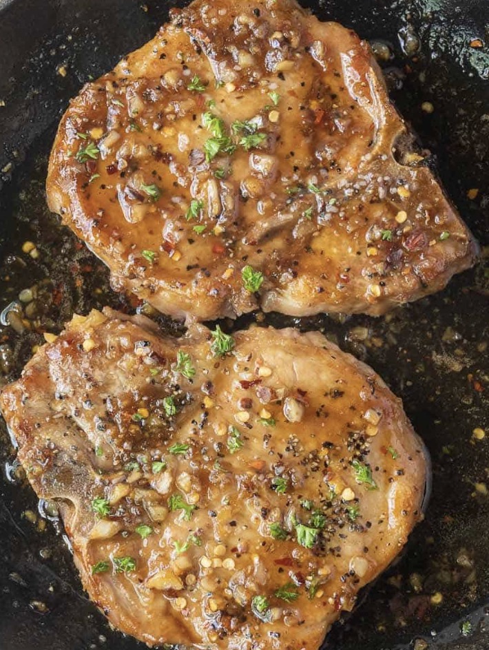 In the same skillet, reduce heat to low; add butter, garlic, brown sugar, and red pepper flakes; whisk until combined; simmer 2-3 minutes. Add pork chops back into the skillet; coat with sauce.