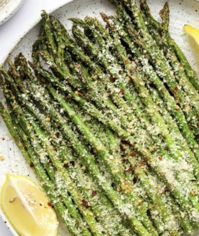 The air fryer makes fresh asparagus tender on the inside and crispy on the outside without a lot of oil. A bit of garlic, lemon juice and seasonings make it absolutely delicious.