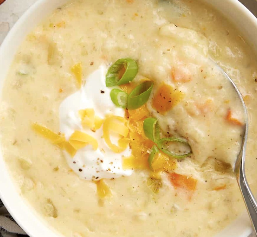 Use a potato masher or immersion blender to mash the potato chunks into smaller pieces. Add 1/2 c. shredded cheese and half of the sliced green onions. Stir until the cheese has melted into the soup.