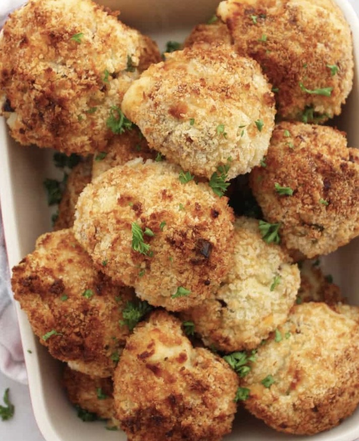Your air fryer can make these delicious mashed potato balls in no time at all. They are like huge potato and cheese filled tater tots. They are crispy on the outside and cheesy on the inside.