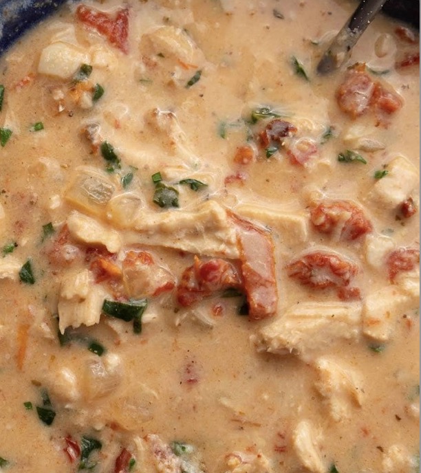 Nothing is better on cold days than a warm, comforting soup. This one is creamy and delicious with sun-dried tomatoes, Parmesan cheese and garlic with shredded chicken. It can be on your table in about 30 minutes to serve to family or company.