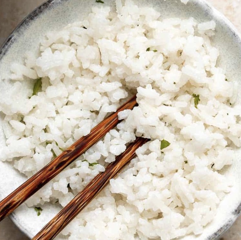 In a medium bowl, rinse the jasmine rice in several changes of cold water until the water runs clear. Drain excess water in a large fine-mesh sieve.