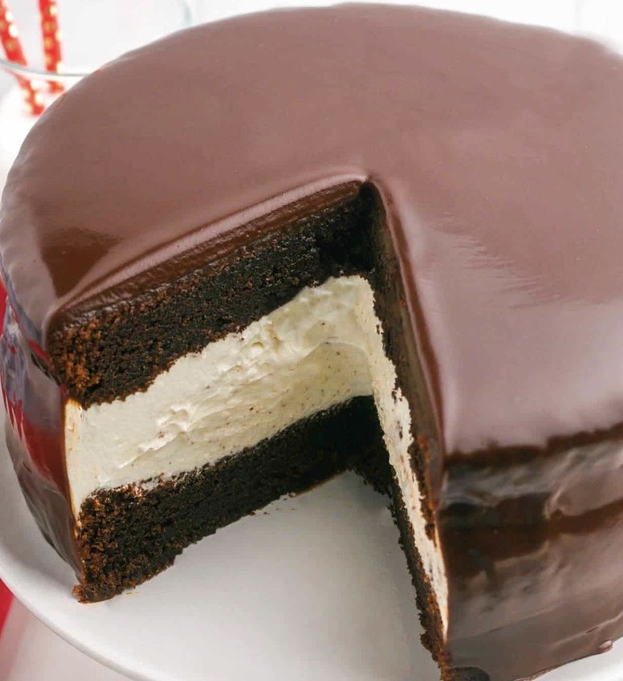 You don't have to be a kid to enjoy this dessert that tastes like a Ding Dong. Make your own for holidays, birthdays or any special occasions. It's chocolate cake with a fluffy vanilla cream filling and a chocolate ganache glaze on top.