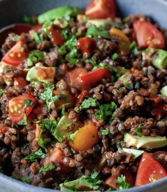 Everyone will be surprised at how good this dish is. It's prepared with already cooked lentils, canned and cherry tomatoes, avocado, jalapeños and seasonings.