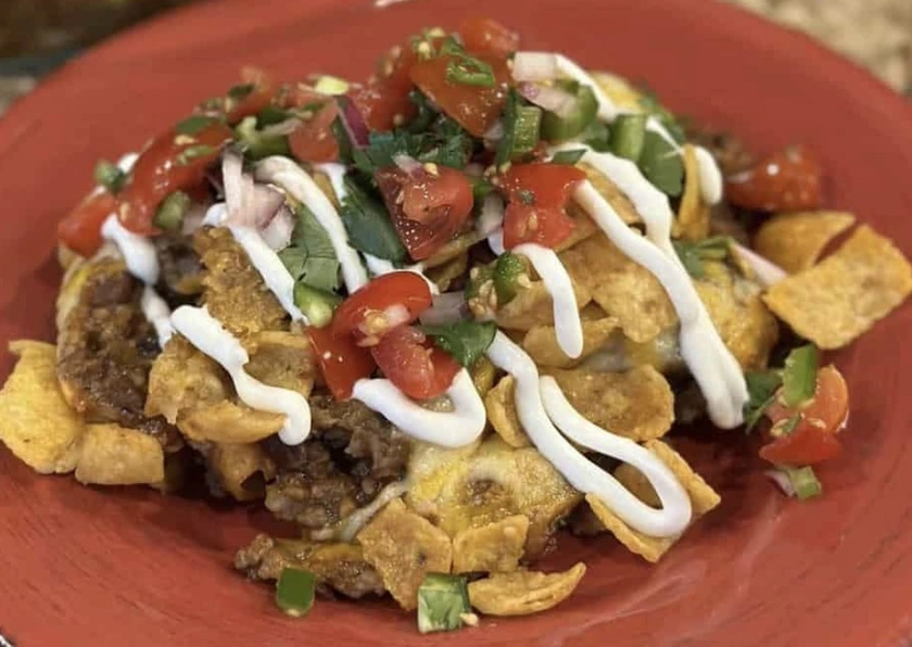 In a 13x9 inch baking/casserole dish, add a layer of half of the Fritos; add half of the cheese blend. Carefully spoon the meat mixture on top, not disturbing the Fritos and cheese layers. Sprinkle the remaining cheese evenly on top.