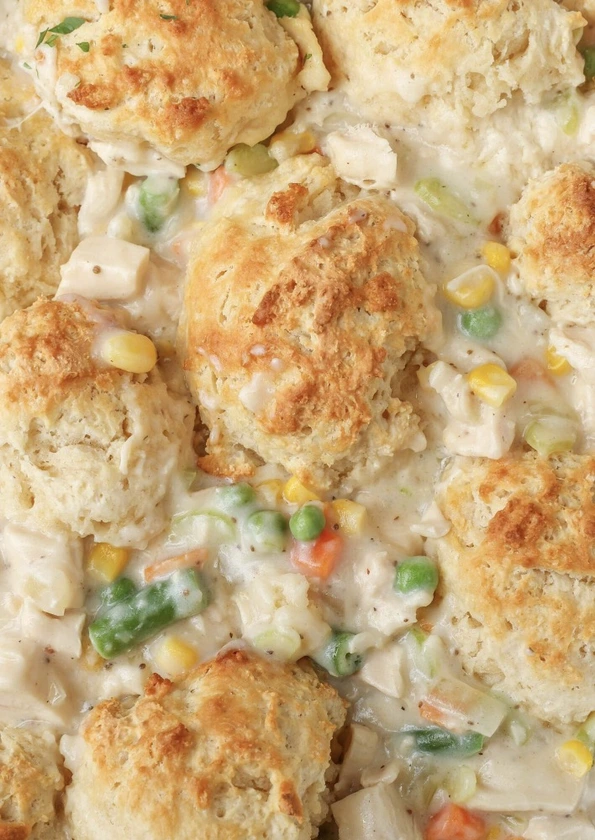This chicken casserole will be a huge hit when you serve it to your family. It's made with tender chicken, vegetables, and a homemade sauce, all topped with buttery, flaky drop biscuits.