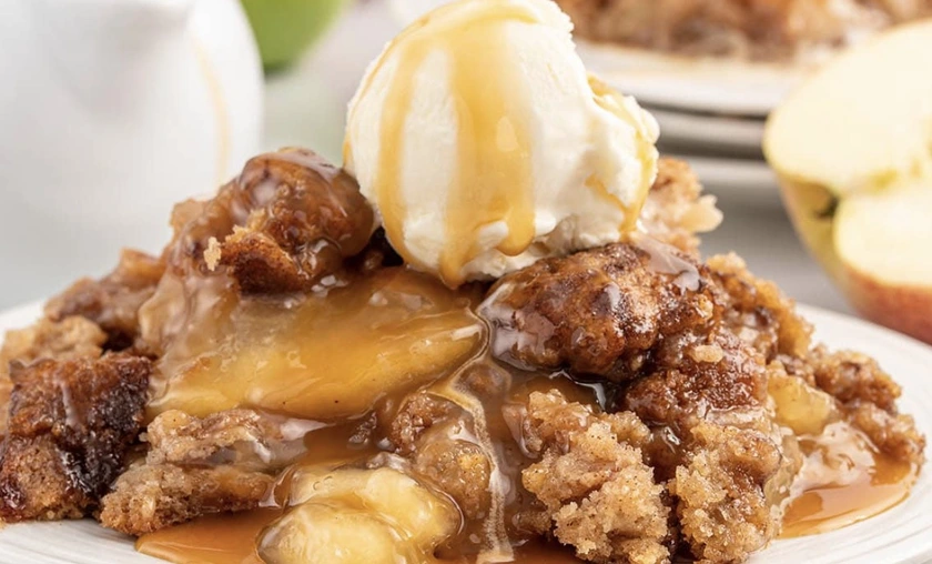 Cool for 5-10 minutes, then drizzle caramel sauce over the surface of the cobbler before serving.