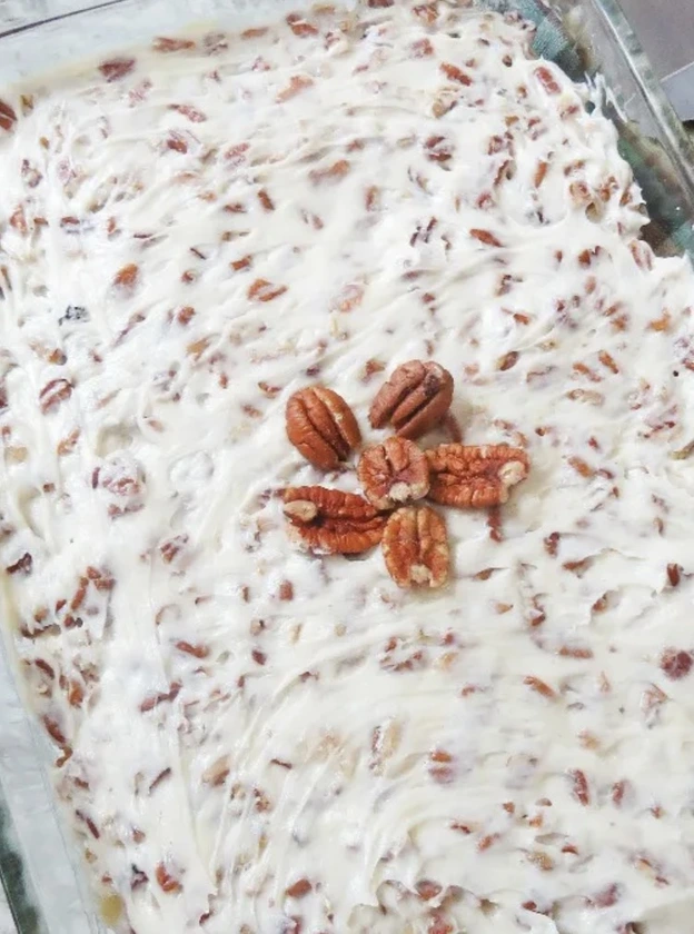 In a large bowl, mix together the cream cheese, butter, and powdered sugar. Add the remaining vanilla and 2 c. crushed pecans mix; spread on the cake. Sprinkle 1 c. crushed pecans on top.